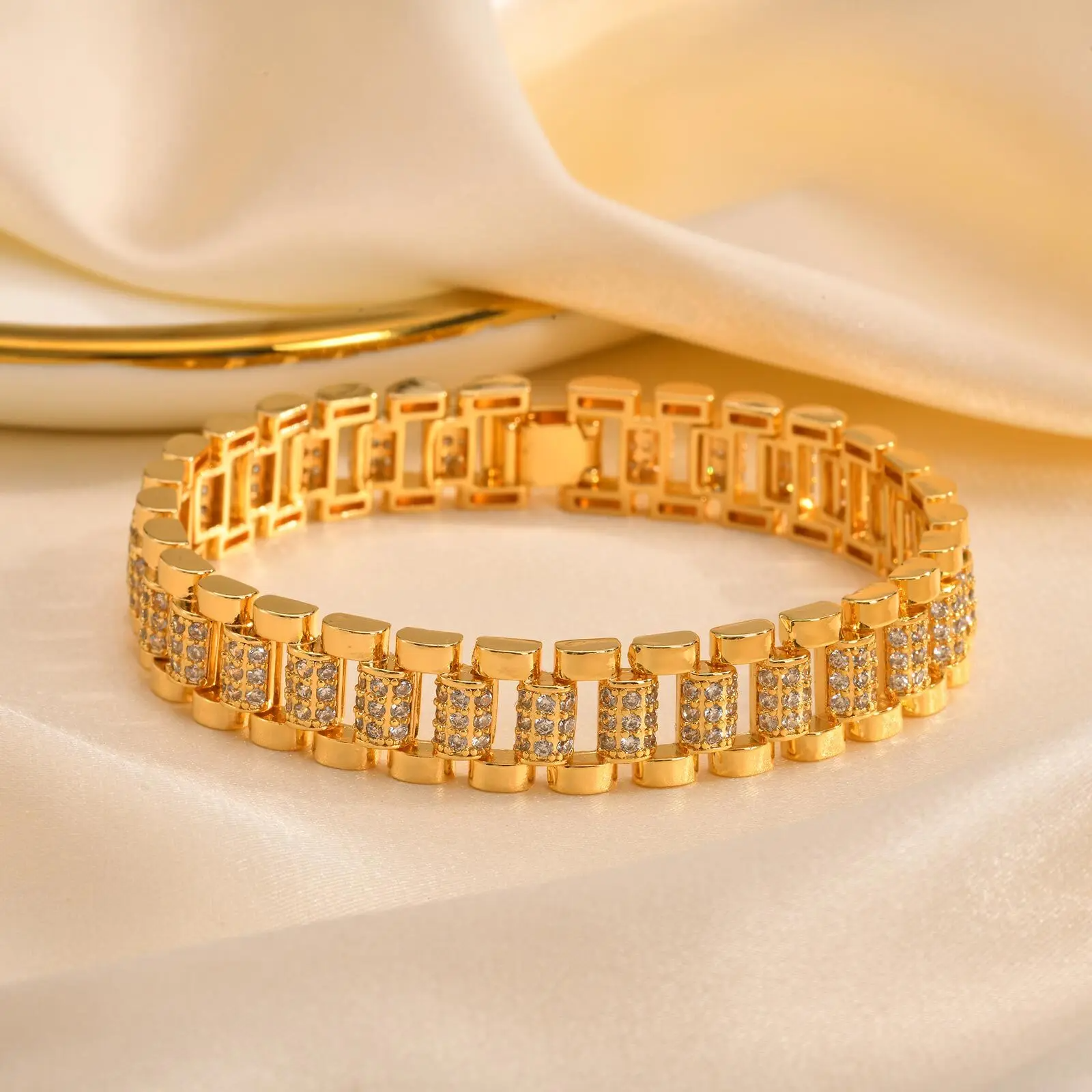 Confeccionada em cobre de alta qualidade, banhada em tom dourado intenso e cravejada com zircônia cúbica, essa pulseira masculina oferece conforto no uso diário e um visual marcante para ocasiões especiais. Seu design de elos largos proporciona presença e personalidade, sendo ideal para compor looks casuais ou sofisticados.